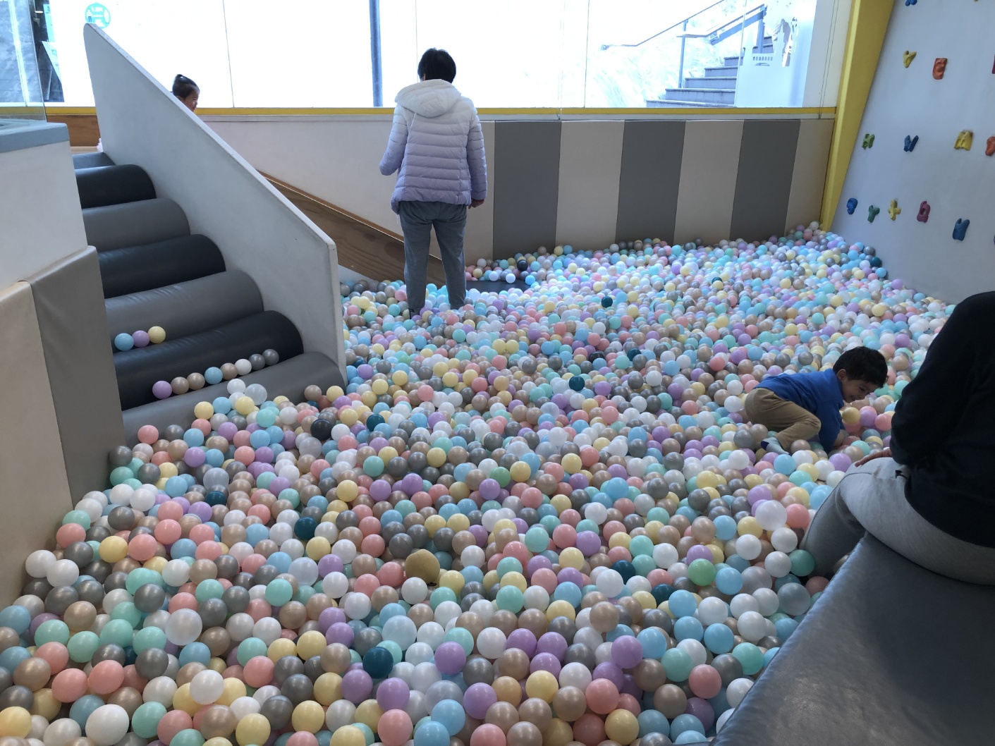 볼풀은 공이 발목까지 차있어서 안전하게 느껴지고 나무 미끄럼틀도 그렇게 높지 않아요. 옆에는 암벽등반 놀이 할 수 있는 공간이 작게 있습니다.