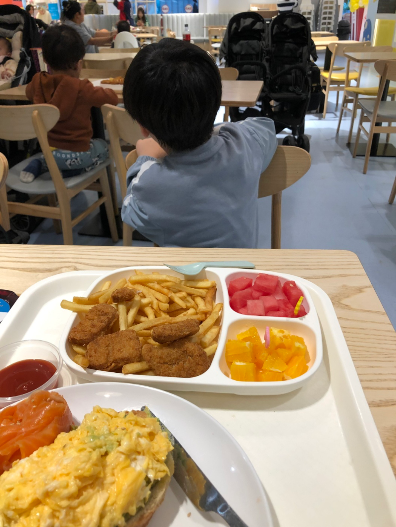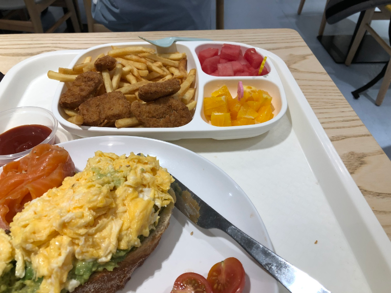 아이는 칩스와 너겟 그리고 과일이 한 접시에 나오는 걸 시켰고 저는 아보카도랑 오믈렛, 훈제 연어 토스트를 시켰는데 이 날 과일 상태가 안좋은 건지 과일이 맛이 없었어요. 그리고 너겟 튀김옷도 두껍고 칩스도 별로고 음식은 많이 안시키는 것을 추천합니다.