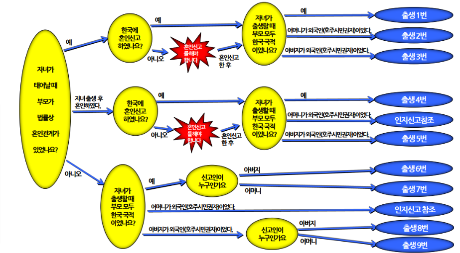 저 그림과 같이 나와있는데 본인의 상황에 맞는 pdf 파일을 열어서 꼼꼼히 작성하시고 모르는 부분은 비워둔 채 영사관에 가셔서 직원분께 묻고 진행하세요. 이렇게 출생신고를 마친후 며칠이 지나면 출생등록이 완료가 됩니다.