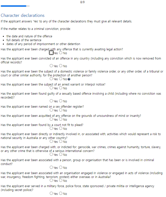 위 화면은 본인의 범죄사실 여부를 묻는 내용인데 읽어보시고 No라고 선택하시면 됩니다. 근데 본인이 범죄사실이 있으시면 절대 속이면 안됩니다.